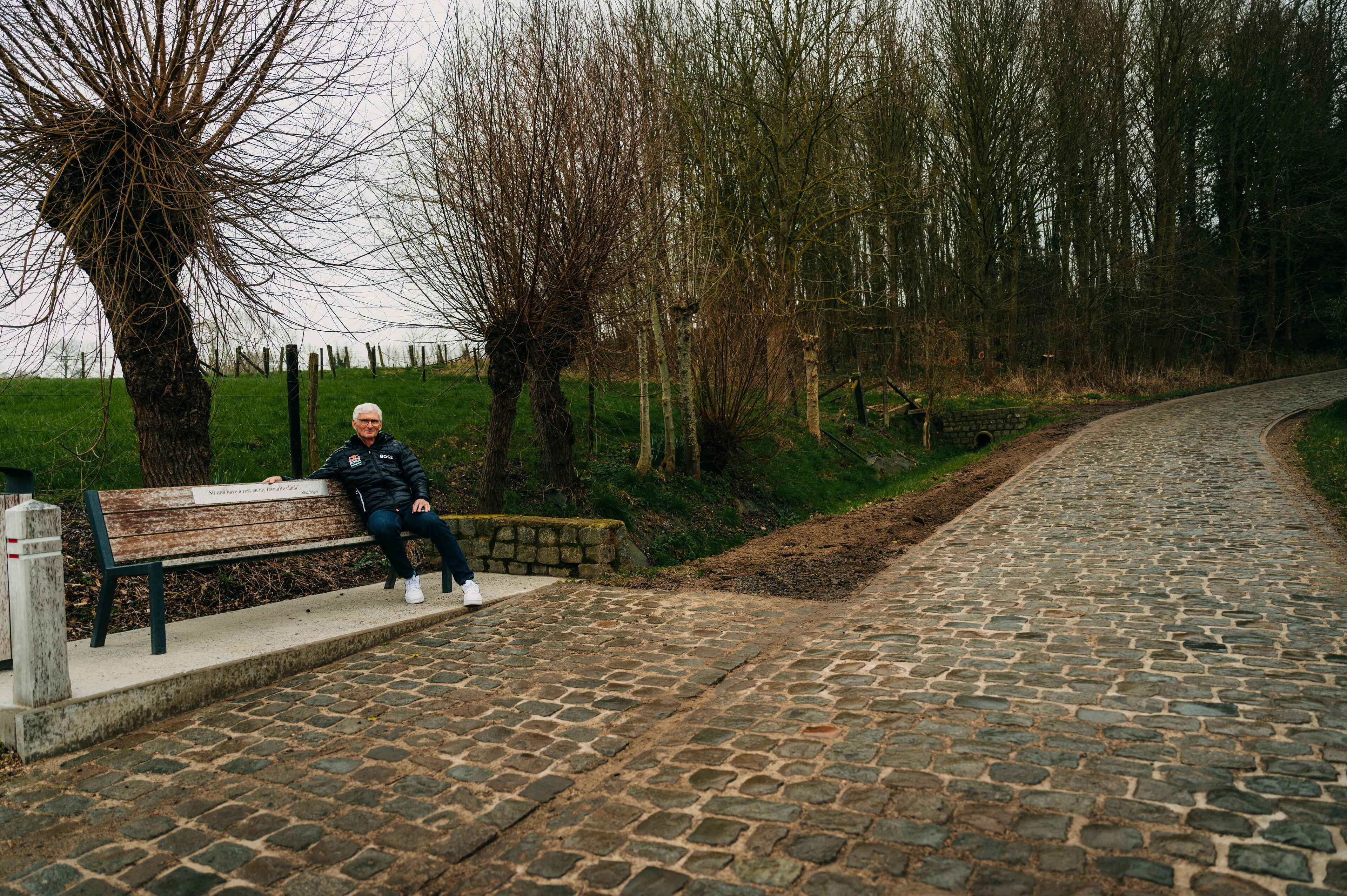 The bank was his wife Katrien's wedding present. "When we got married, she gave me a drawing of a cobbled climb in a forest with a bench," Allan tells the story behind it. "She had asked me sometime before which was my favourite climb here in the Flemish Ardennes. It wasn't until the evening that she told me that the picture wasn't the real present, but that a real bench was being made and would be installed for the next classic season."