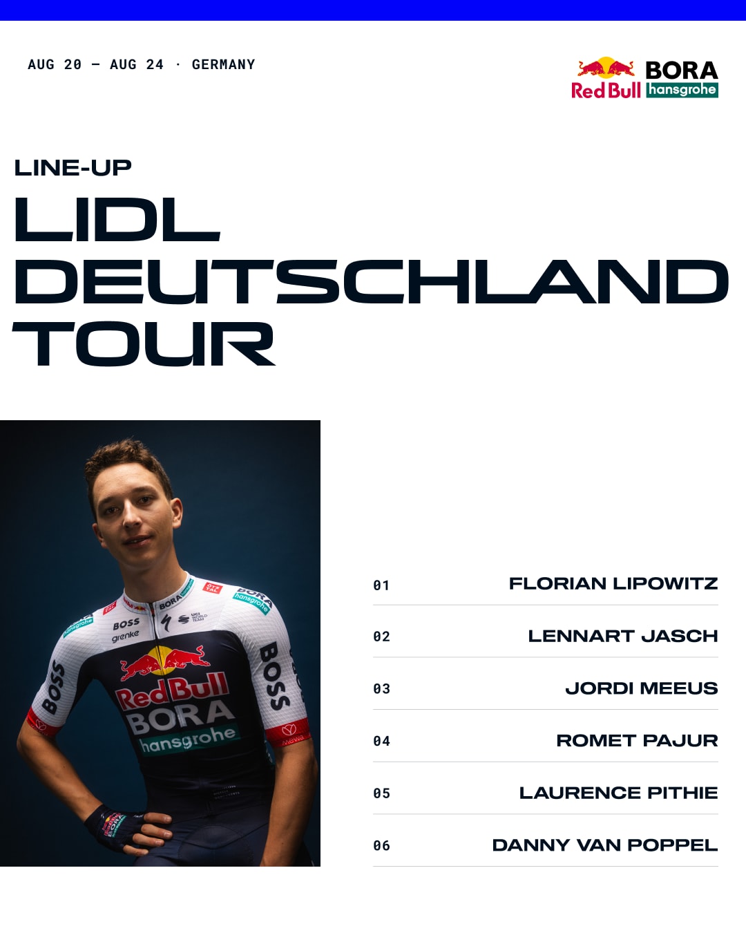 For the more demanding stages, Florian Lipowitz will be joined by Laurence Pithie. He recently showed at the Hamburg Cyclassics that he is already back in strong form after the Tour de France. In addition, Red Bull – BORA – hansgrohe is giving two of its Rookies, Romet Pajur and Lennart Jasch, a chance to ride alongside the WorldTeam.